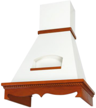 Кухонная вытяжка «Бельведер» отличается резным обрамлением из натурального дуба и небольшой полочкой, которая позволяет хозяйке всегда иметь набор приправ под рукой.